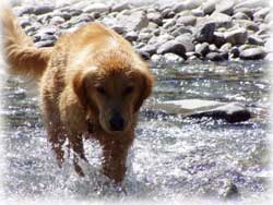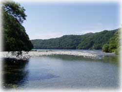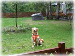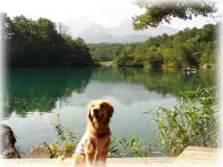 今回は裏磐梯にある「フットルース」さんに行ってきました。 なぜ福島?と言うとこの地は自然がいっぱいです。 私たちが良く行っている、清里や伊豆方面の様に犬のためのアミューズメントが多くありません。 冬はスキー、夏はハイキングやアウトドアといったところでしょうか。 そうなると、自分達で探したりオーナーさんに聞いたりと場所を求めて動くしかないのです。 写真を見てもおわかりだと思いますが、まさしくこの地は絶景だらけです。 まず「秘密の沼」はフットルースさんの 裏側にあり徒歩4〜5分の所にあります。この短い時間が悲惨です。あらかじめ、長靴を借りたのですが、草木を かき分け服は前日降った雨で汚れ、Tシャツには獲体不明の虫がつき、蚊には刺されまくりました。 しかし、この風景を見たとき、そんな事もすっかり忘れ「お〜すっげぇ〜」が第一声でした。 冬になるとこの沼は凍結し雪が積もり、犬には最高の遊び場となり、誰もいない自分達だけの雪上ドッグランに なるそうです。そういう話を聞くと「冬にも」と思ってしまいます。 旅行前、わたくしがあまり仕事を休めず、去年に比べて泳ぎに行く回数がだいぶ減っていました。 だからどうしてもこの旅行では「泳ぎ」をさせたかったのです。 当初、近くの湖で、とも考えていたのですが、「中津川渓谷」と言う名前を知り行ってみました。 フットルースさんは秋元湖畔にあるのですが、湖沿いにとにかく奥に入っていきます。 途中、これ以上無理だろう?という所もありますが、かまわず入って行きます。 すると、落石注意の看板が立っており、それから先は徒歩となります。 河原には降りれますが、浅瀬が多く ウォーターシューズに履き替え、リンが泳げそうなスポットを探しました。それが、次ページの写真です。